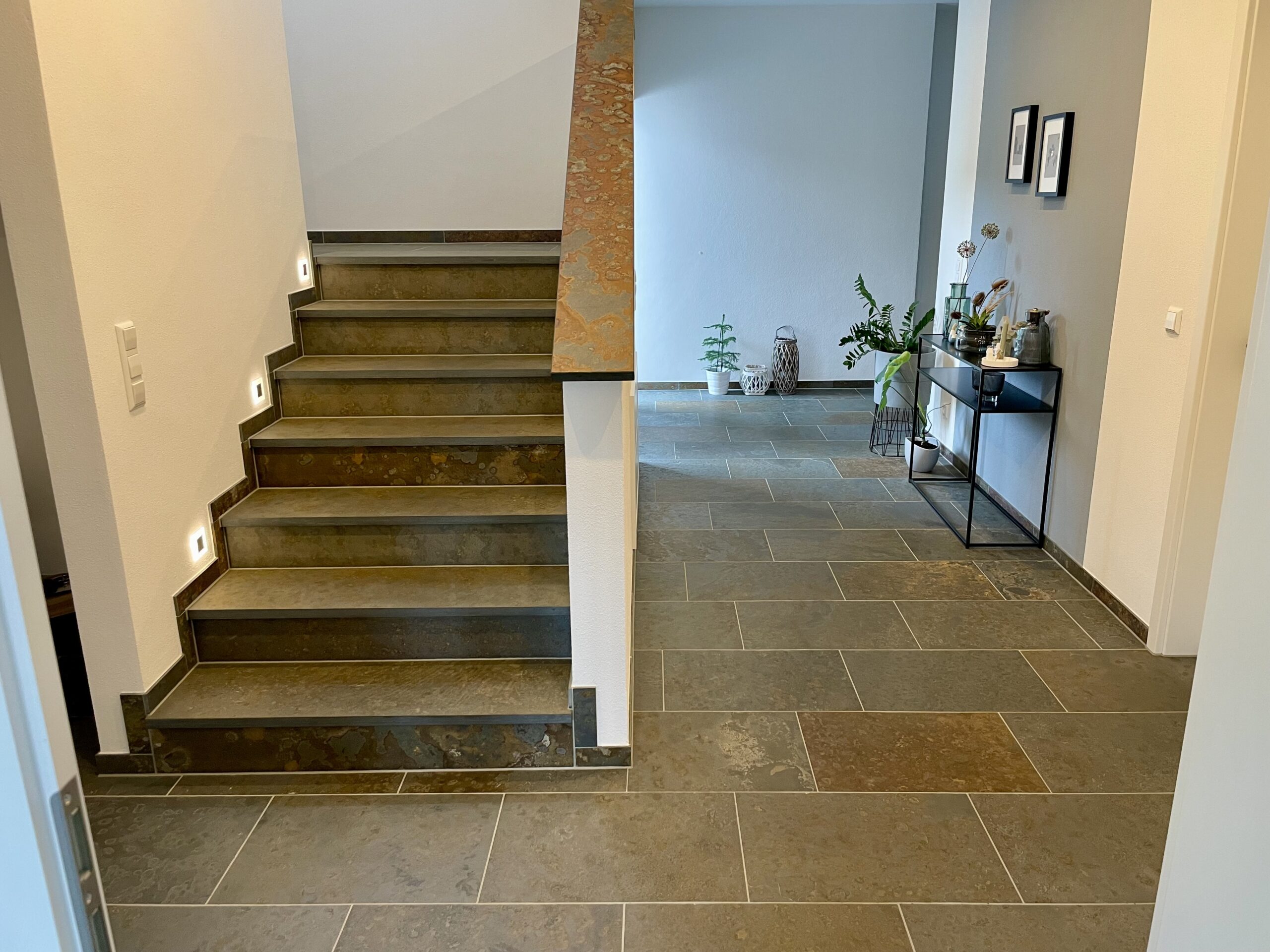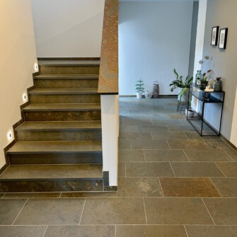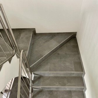 Wenn Sie eine fugenlose Optik auf den Treppenstufen wünschen, ist es möglich, die Stufen aus einer einzigen Fliese zu verlegen. Das gleiche gilt für die Treppenmaterialien aus Granit, Schiefer oder Marmor.
