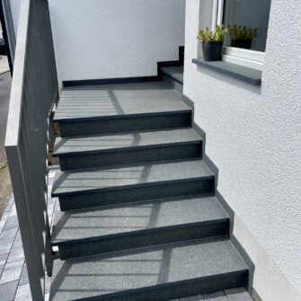 Für eine Außentreppe bietet sich eine Fliese oder ein Naturstein an. Hierbei ist stets auf eine sorgfältige Abdichtung des Untergrundes zu achten.